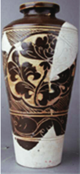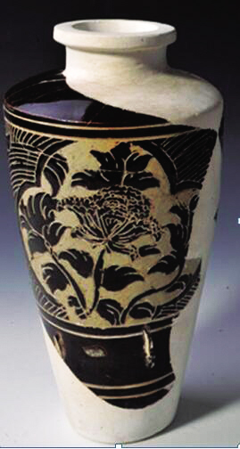西夏經(jīng)瓶是靈武窯最具特色的西夏器類之一,其器型瘦長,肩部最寬,下腹?jié)u收,平底,假圈足;胎質(zhì)細(xì)膩致密,外壁施釉均不到底,內(nèi)壁施滿釉,釉色以褐釉為主,也有黑釉,白釉少見,白釉瓷均施化妝土;紋飾以牡丹花為主,也有菊花,少見海棠花,輔紋以海水波浪紋和斜線紋為主,花紋細(xì)膩,構(gòu)圖流暢,疏密得當(dāng);整體構(gòu)圖大量使用開光,搭配合理,講究對稱。