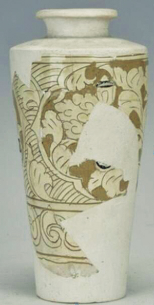 褐釉剔刻菊花紋經(jīng)瓶,高32厘米、口徑8.8厘米、底徑8.9厘米,三級文物。腹部四分葵口紋內(nèi)剔刻開光折枝菊花紋,花瓣細(xì)密舒展,四周花葉搖曳有動感,開光外刻劃花葉紋和弧線紋。其下為兩組雙線弦紋,施褐釉。殘存肩及腹部一半,其余為后修復(fù)。