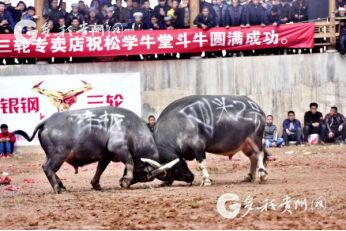 貴州省從江縣第十五屆原生態(tài)侗族大歌節(jié)的前一天,恰逢該縣逢亥斗牛日,丙妹鎮(zhèn)松學(xué)斗牛塘、谷坪鄉(xiāng)四寨河斗牛塘同時(shí)舉辦傳統(tǒng)牛王爭(zhēng)霸賽,喜迎一年一度“侗族大歌節(jié)”的到來,共有來自周邊村寨的80頭水牯牛參戰(zhàn),斗?;顒?dòng)場(chǎng)上名牛角逐,場(chǎng)面異彩紛呈,吸引數(shù)萬名觀眾前來觀戰(zhàn)。