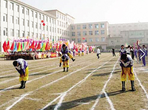 陣擺長龍跑馬城?!胺直矊⑦x良才,陣擺長龍對面排。正欲齊心奪勝券,格格送信出城來。”這首詩描寫的是滿族兒童春季玩的一種游戲——“跑馬城”。玩這種游戲時(shí),孩子們分成人數(shù)相同的兩隊(duì)橫列,面向而站。玩時(shí),甲隊(duì)先誦兒歌一句,乙隊(duì)接下句,一遞一句:“機(jī)機(jī)靈,跑馬場,馬城開,打發(fā)格格送信來!”“你要誰?我要某某某!”被點(diǎn)到名字的兒童立刻向?qū)Ψ經(jīng)_去,對方陣營則手臂相連形成一道防線,沖撞者如果沖破對方的防線,就從對方陣營中挑選一人帶回自己的隊(duì)伍;如果沒有沖破對方的防線,沖撞者就被對方俘虜了。然后雙方再進(jìn)行下一輪“對話”和“沖營”。游戲結(jié)束時(shí),以剩下人數(shù)多的一方為勝方。這種游戲最適合男孩玩,他們往往玩得滿頭大汗,樂此不疲!