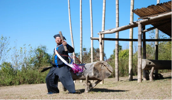 巖相太跳木鼓舞主要有握拳、跺腳、抬腿、提襟等表演動作,用木鼓鼓槌敲打木鼓,敲打木鼓同時領(lǐng)唱與眾人踏節(jié)而歌為伴奏,歌詞多以述說民族歷史、祭祀和勞動生產(chǎn)、生活等方面為內(nèi)容。舞蹈中又加入了佤族女子的“甩發(fā)”動作,使《木鼓舞》在形式和舞蹈語匯方面得到了進一步的豐富,在傳統(tǒng)表演的基礎(chǔ)上融入現(xiàn)代木鼓文化的理念,用肢體語言完整的表達木鼓的意境。