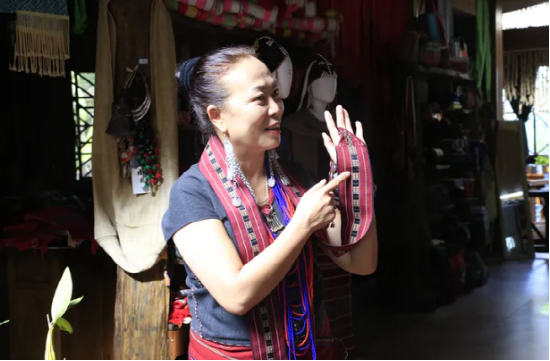 娜紅是勐梭鎮(zhèn)他朗村十組的老婦女主任,十多歲起開始學(xué)習(xí)佤族織錦技藝,隨后加入了李憲蘭工作室?!拔铱靠椮翦\為家里織出了兩層樓房?!蹦燃t感恩佤錦技藝為家里帶來的改變,從前是白天勞動,晚上織布,一年只能賣得2000元?,F(xiàn)在,每個月可以拿到3000元工資,年底還有分紅,日子越來越有盼頭。