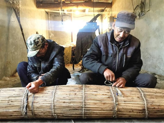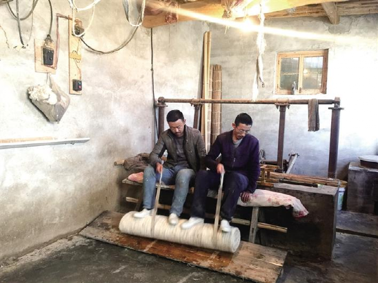接著,父子幾人配合著,開始蹬簾子步驟?!皳{簾子的步驟最關(guān)鍵?!倍藕C髡f,蹬簾子的時(shí)候,蹬的時(shí)間長了不行,短了也不行,要掌握好時(shí)間,才能達(dá)到最好的效果?!澳亩夹枰?xì)化,稍不精細(xì)就會(huì)出現(xiàn)氈散了、爛了,做不成功就廢了?!闭f著,杜占財(cái)和杜占福在杜海明的帶領(lǐng)下,三人用雙腳,來來回回仔細(xì)地進(jìn)行著搟簾子。