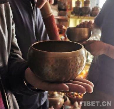 一位店主告訴我,sing bowl在印度和尼泊爾都有,但印度的一般稍大些,尼泊爾的稍小些。我仔細對比了店中的兩種碗,確實如此。同時,有些碗內(nèi)部有紋飾,外部也有相應(yīng)簡易圖形的點綴,比如圓形斑點,但有些碗的內(nèi)壁和外壁無任何紋飾。一般有紋飾的價格要稍高一些,價格從200元至350元不等。但分辨sing bowl質(zhì)量最重要的是看其“唱歌”的音質(zhì)與在手上產(chǎn)生震動的幅度,一般以音質(zhì)低沉雄厚為佳,以震動引發(fā)全身共鳴的程度高為好。但我們的現(xiàn)場演示表明,個人使用的技巧也很重要。