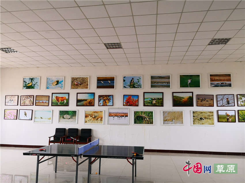 薩如拉圖雅嘎查農(nóng)牧民培訓(xùn)基地展廳,墻上掛滿了廷·巴特爾牧場野生動(dòng)植物攝影作品
