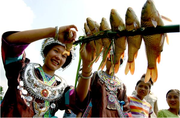燒魚是廣西融水苗胞的習(xí)俗之一,融水的苗族同胞素有在稻田里養(yǎng)魚的習(xí)慣,每年春插,苗家人向來(lái)喜歡在稻田里放養(yǎng)鯉魚。每年的秋收稻黃時(shí)節(jié)也是田鯉肥壯之時(shí),這時(shí)來(lái)自四鄉(xiāng)八寨眾多的各民族兄弟便匯聚起來(lái),點(diǎn)燃一堆堆篝火,燒田鯉吃野餐,盡享豐收喜悅。燒魚從9月稻黃收割開(kāi)始持續(xù)到12月底才正式結(jié)束,故名“元寶山金秋燒魚季”。燒魚季節(jié),苗寨家家戶戶釀起醇濃的甜酒,蒸著香噴噴的糯米飯,帶上食鹽、辣椒、蒜苗、蔥花、薄荷等佐料上山去剪禾。晌午時(shí)候,他們?cè)谔镱^或田邊的平地?zé)鹨欢讯洋艋?,從田里抓?lái)一籠籠活蹦亂跳的鯉魚,用樹(shù)枝或竹片把魚一條條串起,排成一排,然后放在紅彤彤的火炭上翻來(lái)覆去地烤,大約半小時(shí)左右,魚被烤炙得“呲呲”作響,水分烤干,慢慢地變黃,直至熟透,香飄四溢,遠(yuǎn)遠(yuǎn)就可聞到香味。