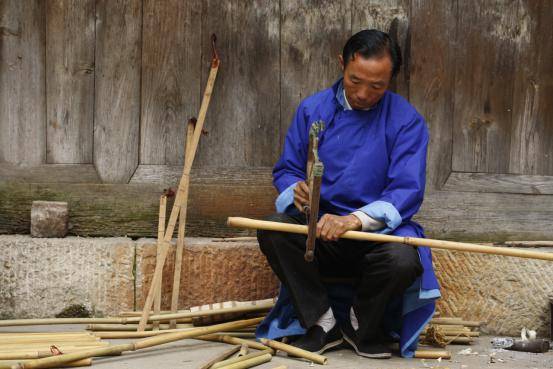 制作蘆笙大的工序有12道,再細一點有幾十項。如第一道是到山上去選竹子,拿尺子慢慢比劃,三拳的有多長,要很細心地選,確實可以用。取下來之后,第二道工序是拿到河邊去洗,用紗布搓。因為竹管有很多斑點,關(guān)節(jié)處有很多毛,要很細致的把那些東西全搓掉。弄好之后用太陽曬,曬干曬白。第三道工序,就是取杉樹的木頭做笙斗,計劃好做三拳的是多少公分,四拳是多少公分。十二道工序,后面越學(xué)越復(fù)雜,每一道工序都很講究。