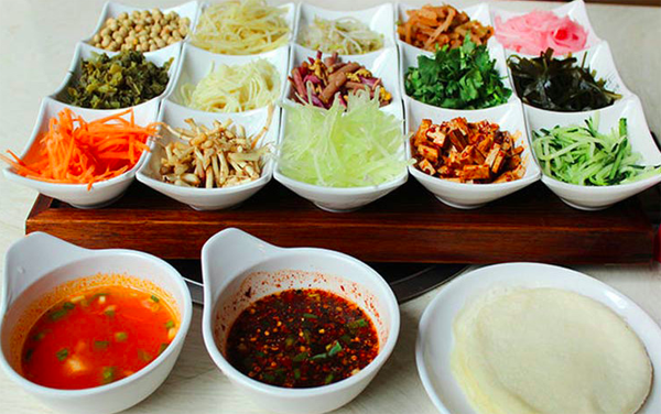 制作方法:烙。面粉加水,鹽少許揉勻搟透(水與面粉比例為1:6),平鍋燒熱刷油、擦干,然后左手抓起面團(tuán)甩圓并向鍋底杵一下成為直徑為9厘米的圓薄皮時(shí),右手立即把圓形面皮揭起,這樣制作數(shù)十張春卷皮,放入蒸籠稍蒸一下使其回軟,便于包食。再將綠豆芽、海帶絲、芹菜節(jié)、蕨菜節(jié)用開水氽過,分別裝入小盤中,小碗內(nèi)放入醬油、醋、味精、麻油、姜沫、蔥花、辣椒兌成汁。春卷皮中放入各種素菜絲包成上大下小的兜形,放入酥黃豆或油炸花生,澆淋兌好的辣椒汁即成。