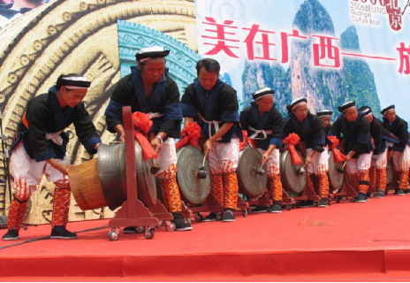 銅鼓舞,在廣西都安、巴馬、東蘭、馬山一帶的瑤族地區(qū)盛行。每年農(nóng)歷五月二十九過“祝著節(jié)”(年節(jié)),要敲12天銅鼓,表示懷念祖宗和預(yù)祝豐收。節(jié)日隆重,聚眾數(shù)以千記。跳舞時,用銅鼓一對,其意一雌一雄,公聲小,母聲大。由兩男敲擊,兩男持雨帽回環(huán)擊鼓者扇搖,還有兩男兩女,應(yīng)鼓樂節(jié)奏翩翩起舞,舞姿雄健優(yōu)美,氣氛熱烈,十分感人。