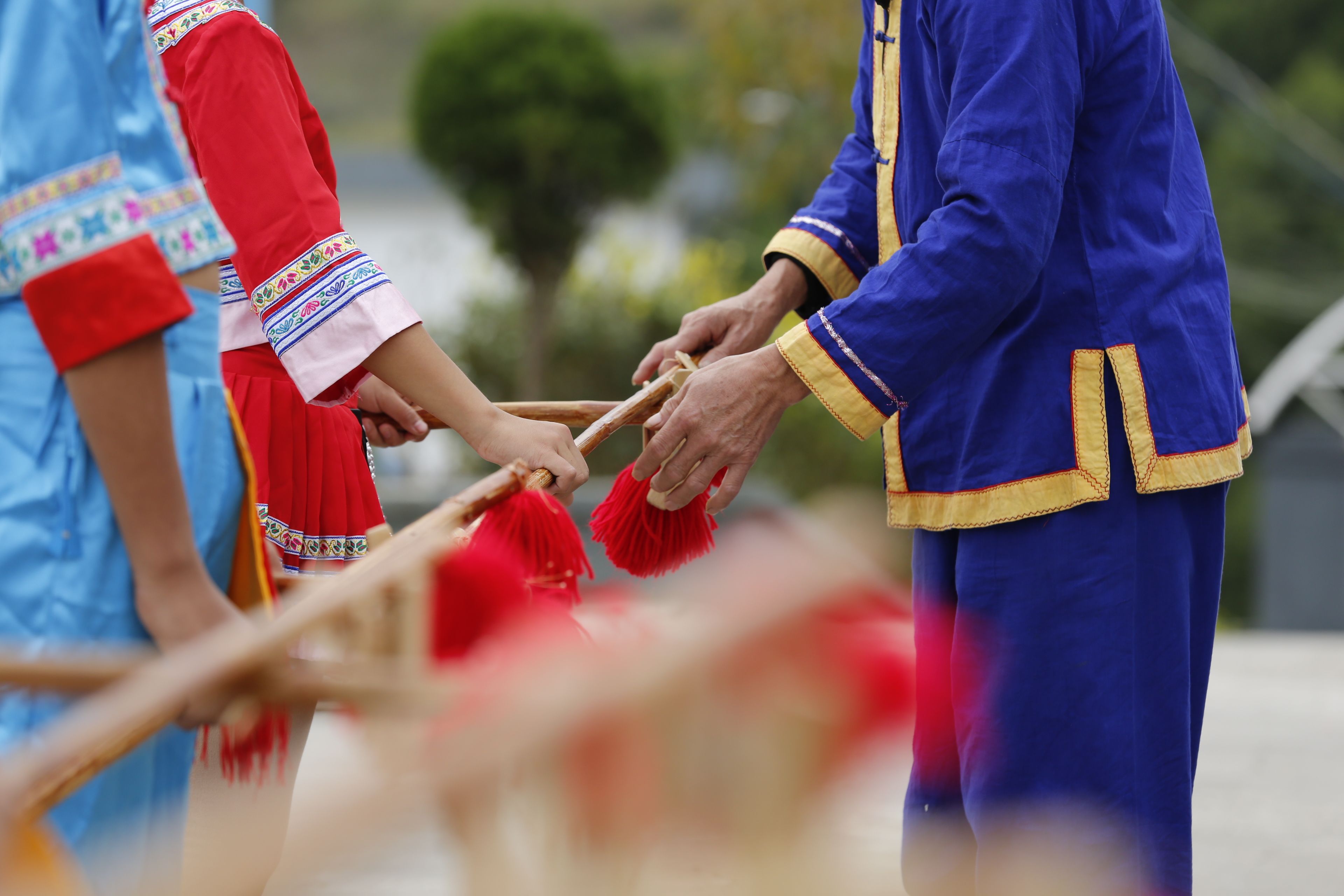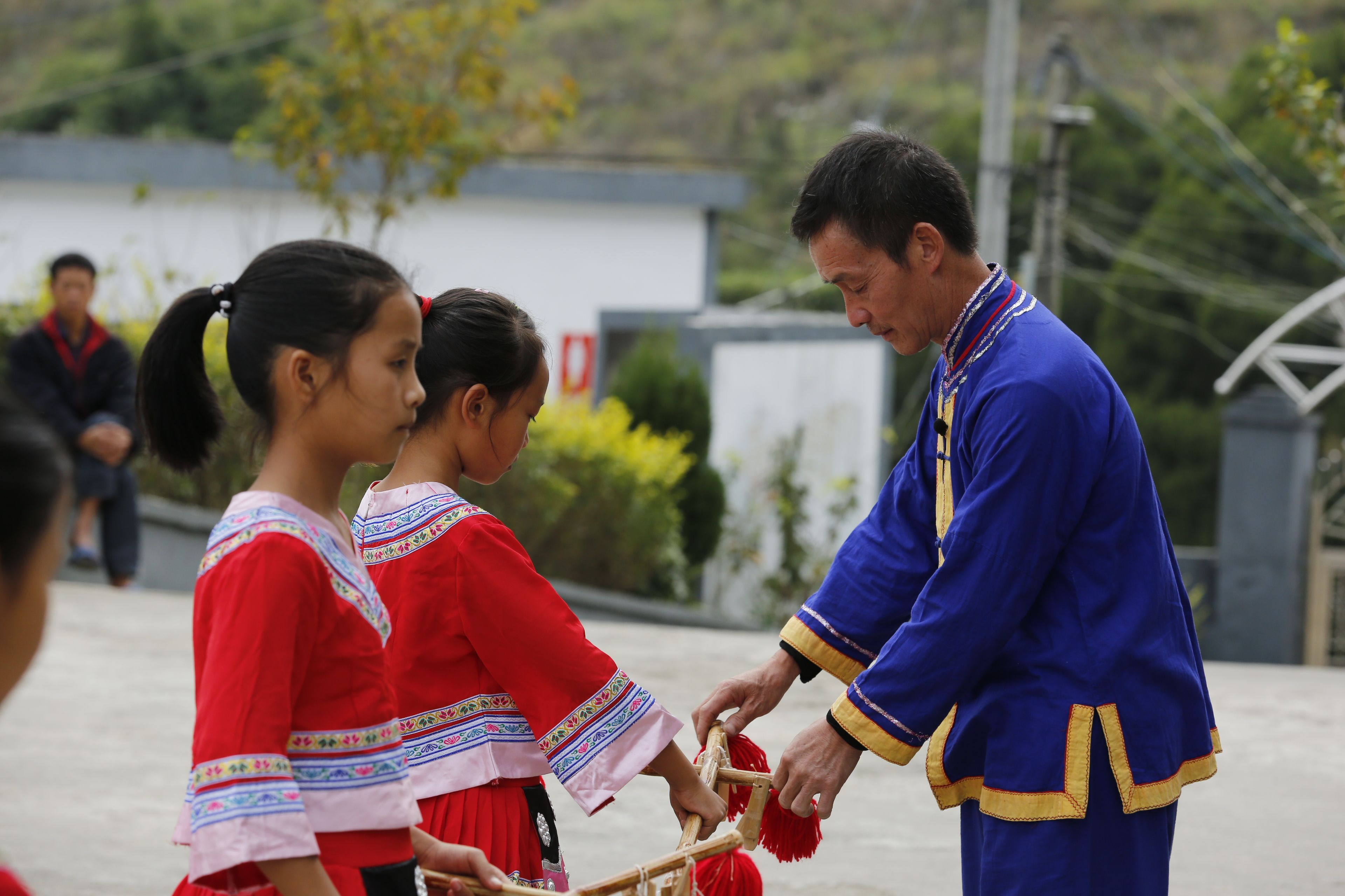 貴州貴陽苗族長竹舞傳承人教孩子們持竿手法