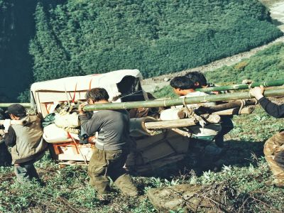 圖片名稱(chēng):村民們把仔細(xì)打包的鋼琴抬回村里