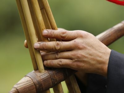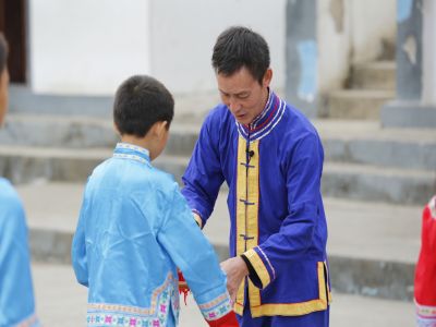 貴州貴陽(yáng)苗族長(zhǎng)竹舞傳承人教孩...